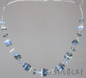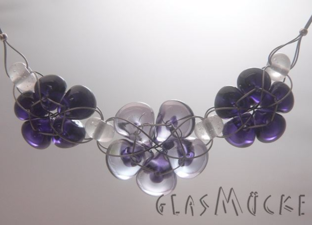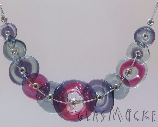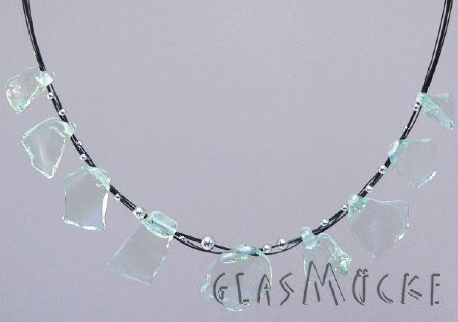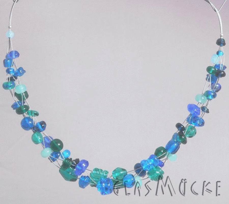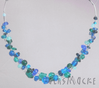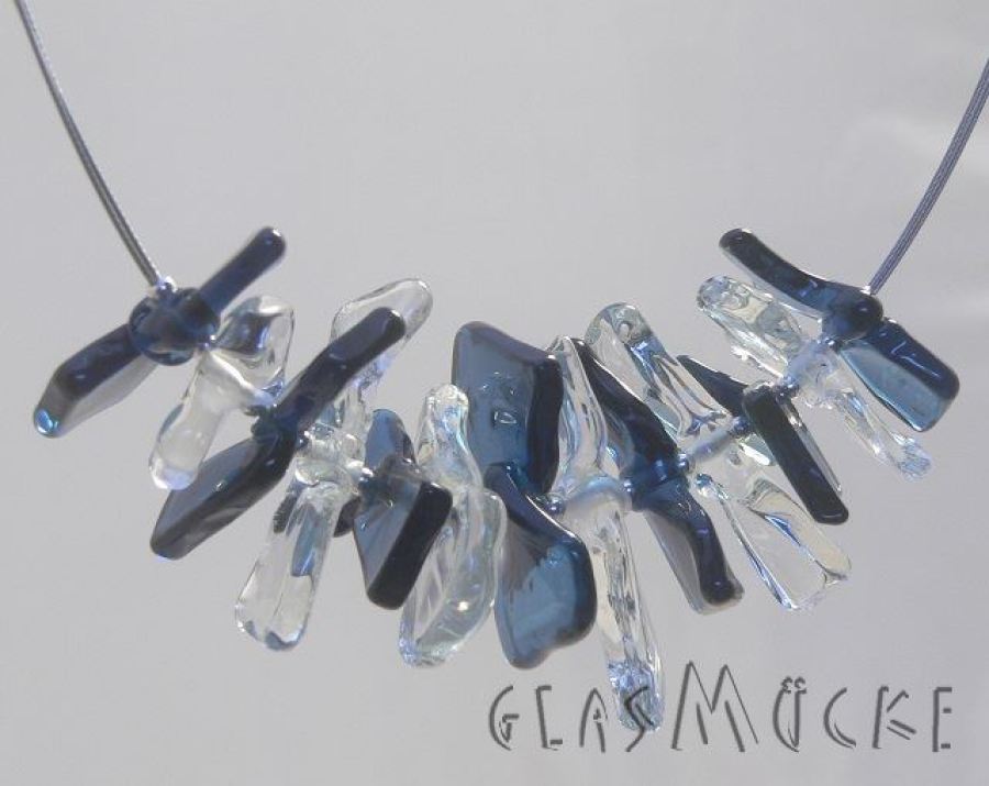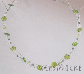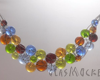 Das GlasMücke-Collier: Diese kurzen Colliers gibt es in allen Farben. Leuchtendes Rot, kühl-elegantes Graublau, warmes Bernstein oder frisches Grün, ergänzt mit farblich abgestimmten Kristallen und schimmernden Perlen von Swarovski®.
